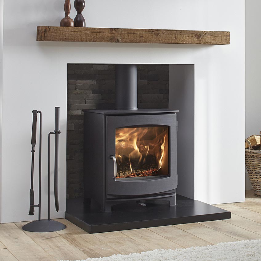 Ivar 5, Low is a versatile stove with external air connection that can burn wood, and when the Mulfti-Fuel kit is added, coke or coal. It has a large viewing window and can be freestanding or installed into an inglenook chimney opening. With a heat output of 4-7 kW, it can easily heat a large room, but its low emissions qualify it for DEFRA approval in smokeless zones.