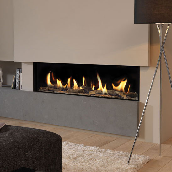 The Metro 150XT Eco Wave is 1.5 metres wide and features a fire bed of beautiful logs set off by a border of white stones. The interior is in mirrored Ceraglass, creating added visual depth to the flame picture. It has a generous heat output of 10.8 kW with an impressive efficiency rating of 78%, far superior to ordinary gas fires.